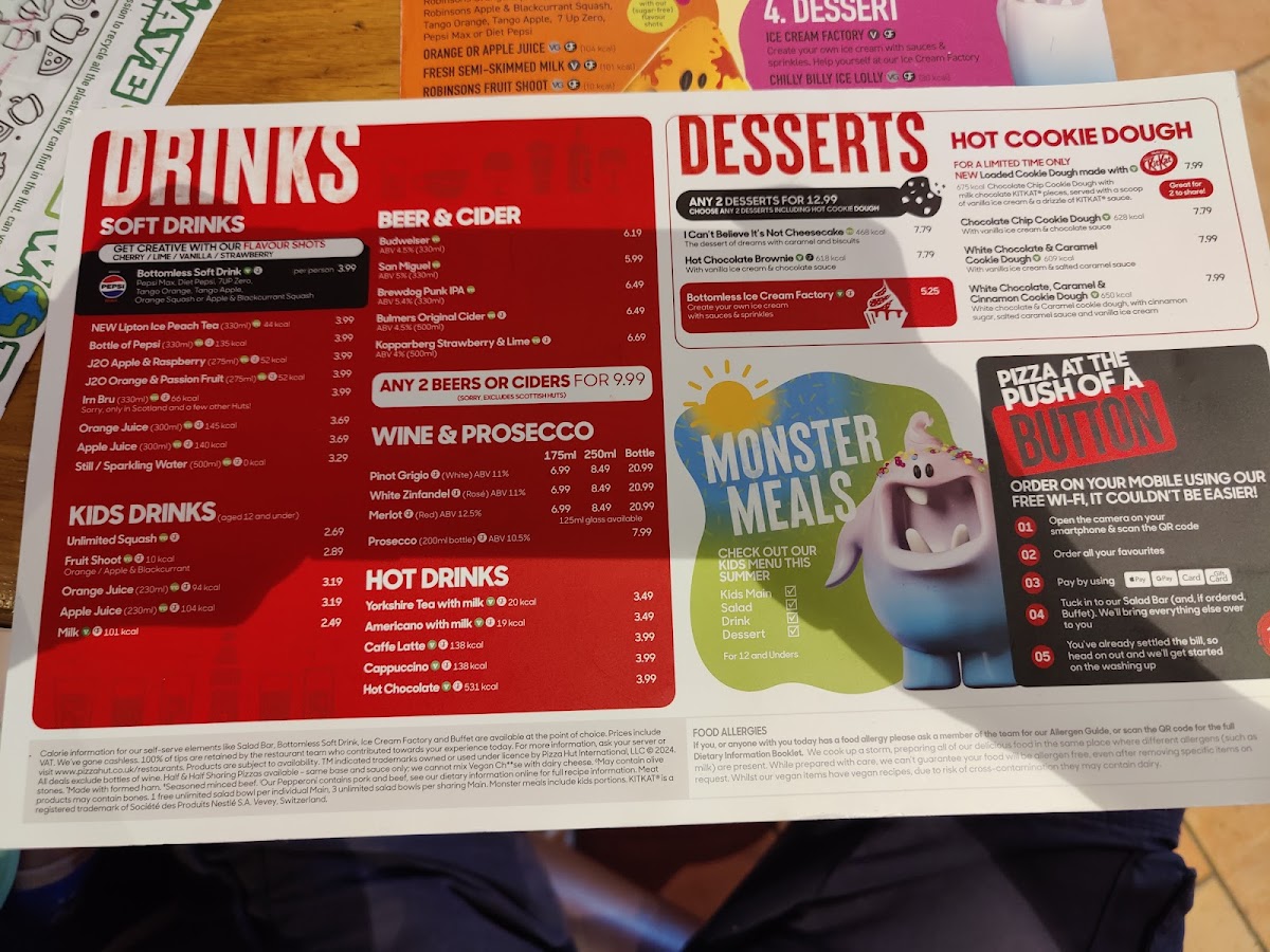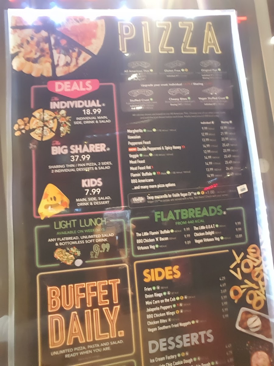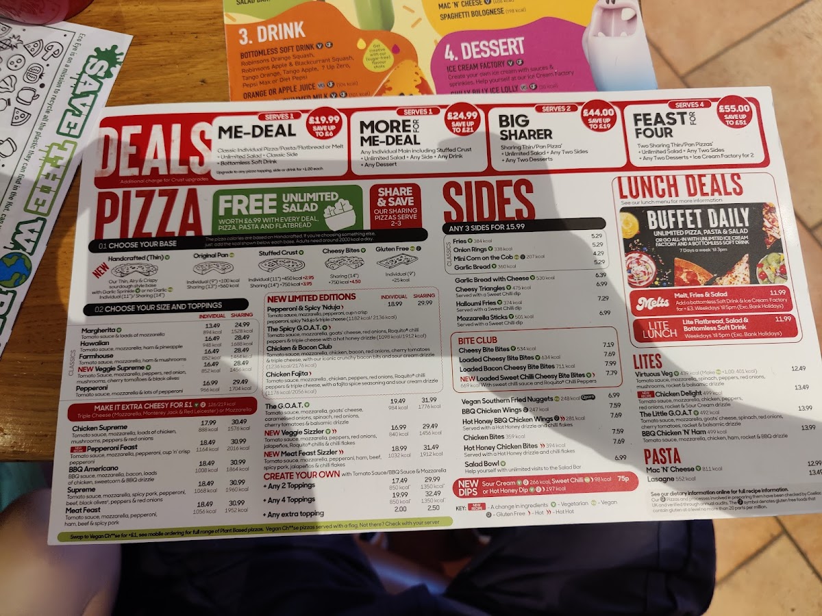What sets this location apart is its consistency and attentiveness. From the moment you walk in, the staff ensure a warm welcome and are quick to guide you through ordering, whether you’re opting for the famous all-you-can-eat buffet or dining à la carte. The buffet, in particular, offers great value, especially for families or groups, with an ample selection of pizzas-classic Margherita to Meat Feast-and a fresh salad bar that’s replenished regularly.